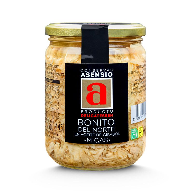 Migas de Bonito del Norte en aceite de girasol. Envase de 385 gramos de peso neto y 250 gramos de peso escurrido.