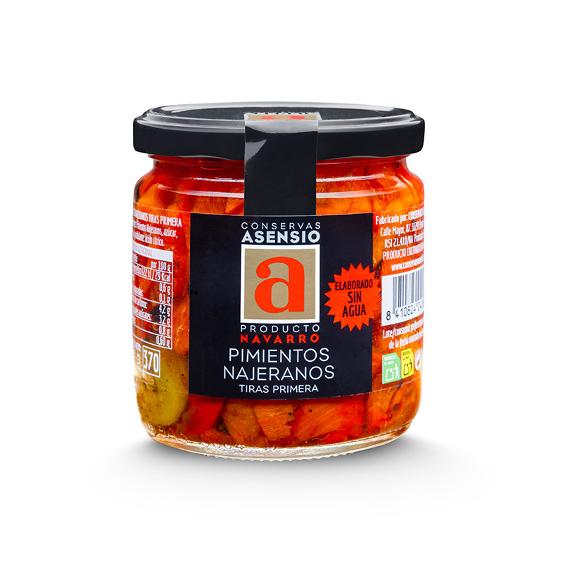 Frasco de 325 gramos de pimientos variedad NAJARANOS TIRAS asados al fuego. La variedad NAJERA corresponde con un pimiento más carnoso que el piquillo, lo que permite añadirlo a guisos o segundas cocciones. Su color va desde el verde hasta el rojo anaranjado, ya que es un pimiento que no tiene las tonalidades de rojo más fuerte. Elaboración propia al modo artesanal, una vez asados, se han pelado (eliminación de la piel tostada) sin contacto con agua, por lo que guardan todos los aromas del asado tradicional.