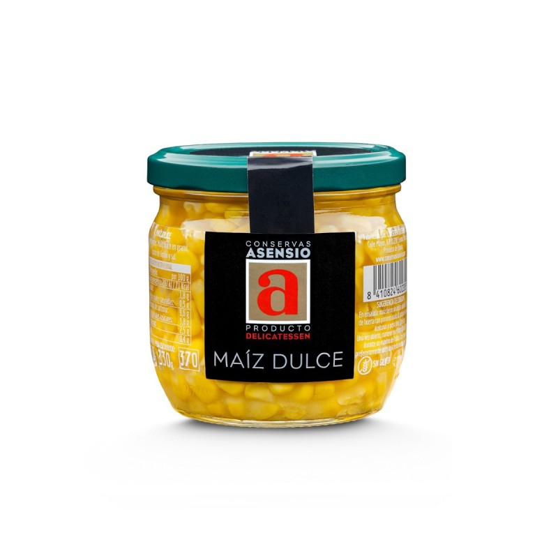 Maíz dulce en grano envasado en un frasco de cristal de 330 gramos de peso neto y 230 gramos de escurrido. Se añade zumo de limón exprimido y sal. No se utilizan ni conservantes ni colorantes, ni azúcares añadidos. Especialmente recomendado para sus ensaladas y guarniciones varias. Textura impecable.